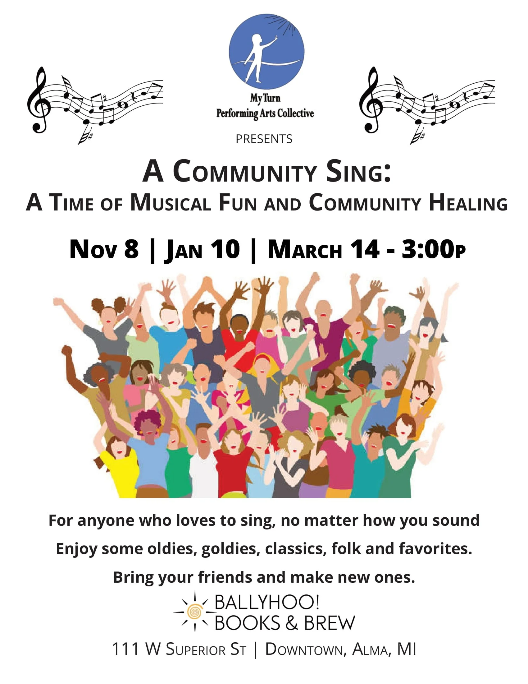 My Turn is sponsoring a Community Sing at Ballyhoo Books and Brew, downtown Alma. This is a chance for anyone and everyone who loves to sing, or to listen to singing, to get together and experience the fun and healing effects of communal singing. We will sing oldies, goldies, and favorites. Nov 8, 2025, Jan 10, 2026 and March 14, 2026, at 3pm we will come together for the fun of singing. Join us.